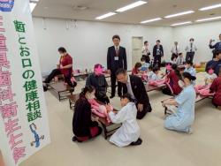 令和7年6月8日(日)津リージョンプラザにて、歯の健康展が開催されました。 歯科医師による口腔がん検診は今年もたくさんの方が受けられました。また、30名の事前予約制の歯みがきレッスンコーナーでは、昨年から導入された顎模型付きのぬいぐるみにピンク色の人工プラークを塗布し、白衣姿に変身してブラッシング体験をしてもらいました。ピンク色でプラークが目で見て分かると頑張って磨かないと!とみなさん一生懸命みがいていただきました。それでもお子さんだけでは磨き残しがどうしても出てしまうため、仕上げ磨きの重要性やフロスなどの使い方を保護者の方にお伝えし、今日からがんばってきれいにしようとお約束してくれたお子さんもいらっしゃいました。また、去年も好評だった災害コーナーでは、昨年1月に発生した能登半島地震への災害歯科支援チームに参加した森下るみさんから、災害時でも口腔ケアを行う必要性や、避難所での口腔ケアの方法について説明がありました。今年は幅広い年齢の方々に熱心に聴いていただけ、高齢の方だけでなく子ども連れの方々からもたくさんご質問をいただきました。「避難袋は準備しているけど歯ブラシは入れてなかった!」「断水で水が確保できないとうがいもこんなに少ない量でしかできないの!?」と驚きの声も聞かれました。今日のイベントが改めてお口の健康について考えるきっかけになれば嬉しく思います。(津支部:森下さおり)